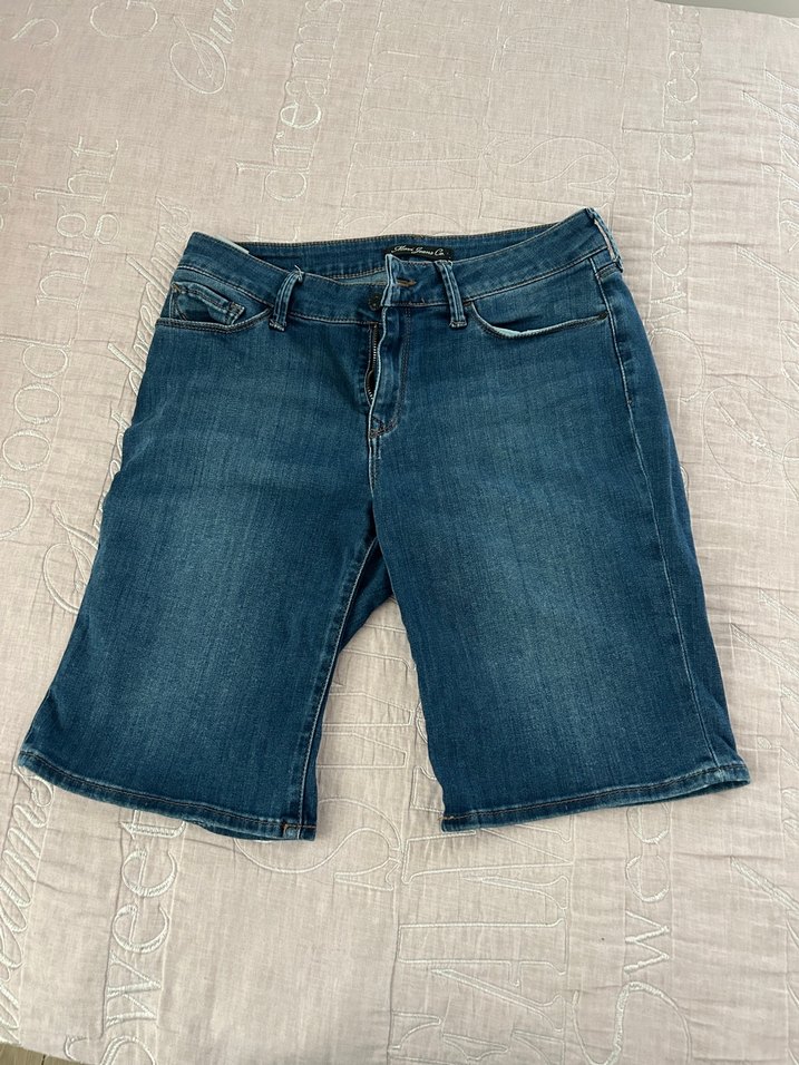 Mavi kot şort, rahat kesim ve katlanabilir paça.