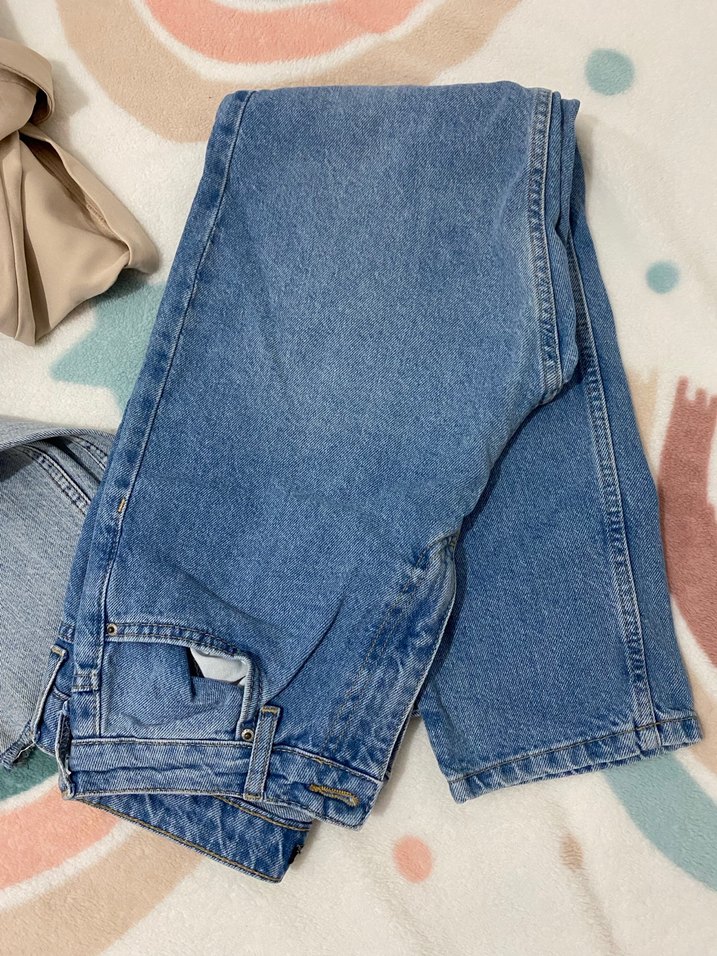 Mavi renkli, rahat kesim, midi boy kadın denim pantolon. Desensiz ve günlük kullanıma uygun, sokak modasına uygun rahat bir tarz sunar.