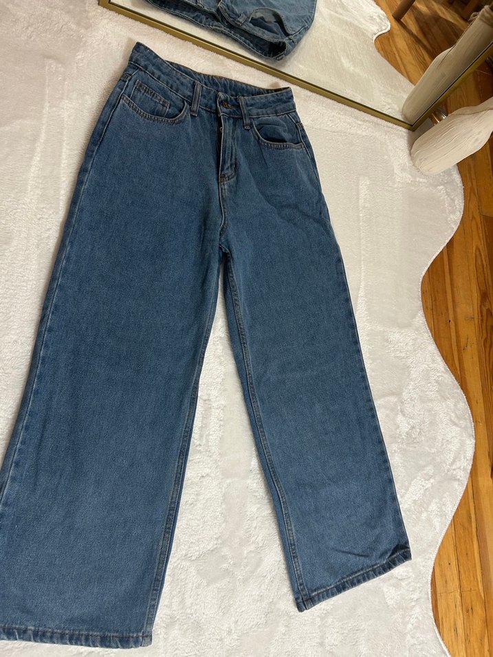Pastel mavi renkte, rahat kesim ve midi boy kot pantolon, günlük kullanım için zahmetsiz şıklık sunar.
