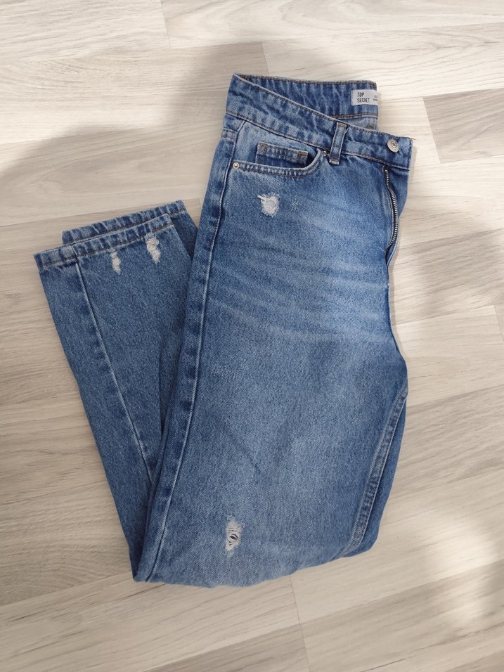 Mavi kot pantolon, rahat kesim ve normal midi boyda. Günlük sokak stiline uygun, hafif yıpranmış detaylarla zahmetsiz şıklık sunar.