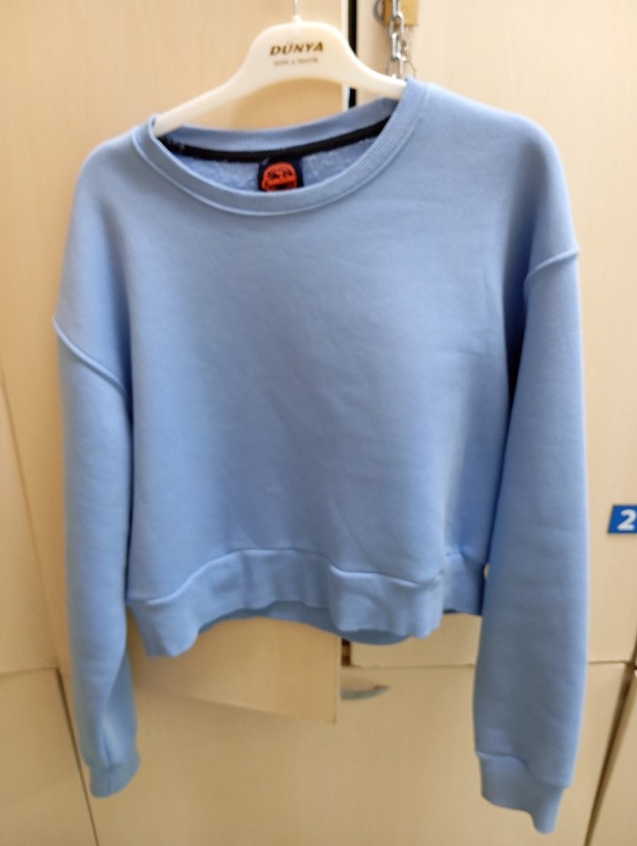 Pastel mavi renk, yuvarlak yaka ve uzun kollu kadın sweatshirtü. Yumuşak ve sıcak kumaştan, rahat kesim ve normal boyda. Günlük kullanıma uygun, desen içermeyen sade tasarım. "DUNYA" markalı.