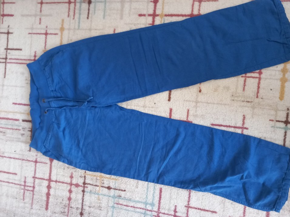 Parlak görünümlü mavi keten, rahat kesim kadın pantolon. Günlük sokak stili için sade ve şık bir tercih.