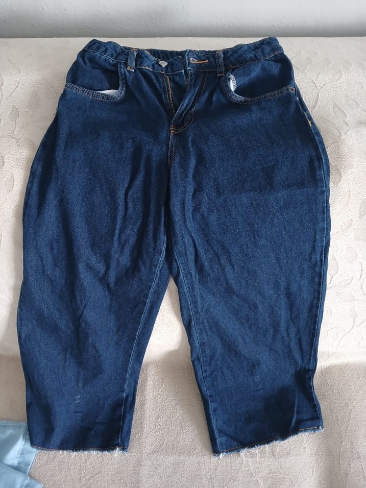 Parlak mavi renkte, midi boy ve rahat kesim kot pantolon. Desensiz ve gündelik kullanıma uygun, zahmetsiz şıklık sunar.