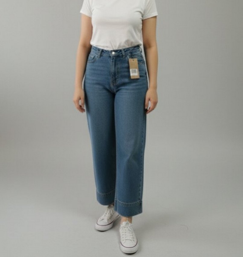 Mavi renkte, rahat kesim ve midi boy kot pantolon, gündelik sokak tarzı için ideal, zahmetsiz şıklık sunar.