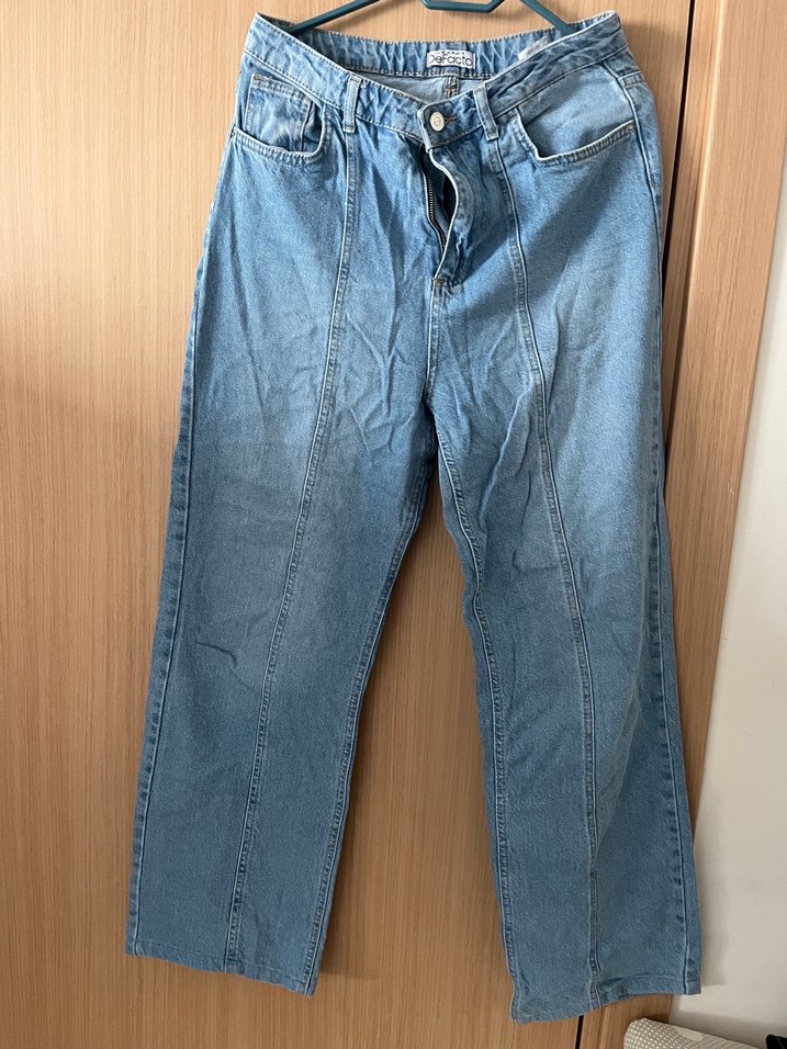 Mavi denim kumaştan, rahat kesim ve midi boyda, gündelik kullanıma uygun sokak stilinde kadın jean pantolon.
