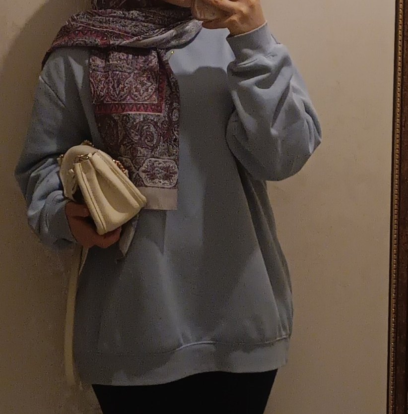 Pastel mavi renk, yuvarlak yaka, uzun kollu, rahat kesim midi sweatshirt, yumuşak ve sıcak kumaştan, günlük kullanım için zahmetsiz şıklık sunar.