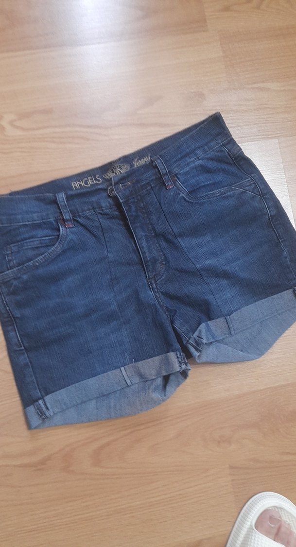 Parlak mavi renkte, rahat kesim mini denim şort, katlanmış paça ve bel kısmında "ANGELS" yazısı ile günlük sokak stiline uygun.