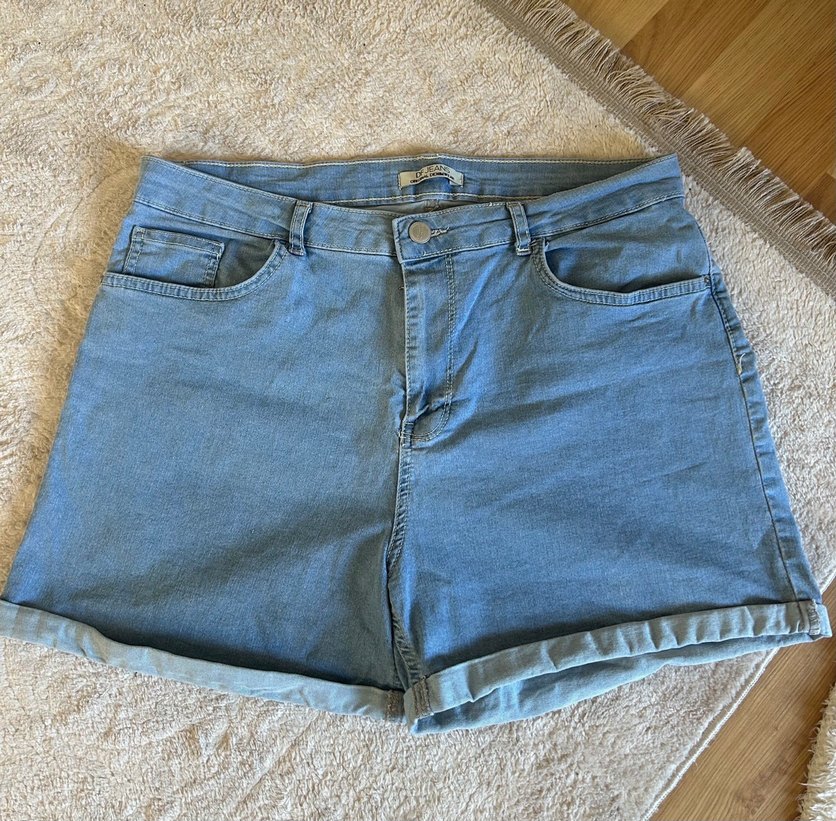 Mavi, rahat kesim, kısa paçalı ve katlamalı mini kot şort, gündelik rahat sokak stili için ideal. Boyu 36 cm bel 86 esnek bir kumaşa sahip