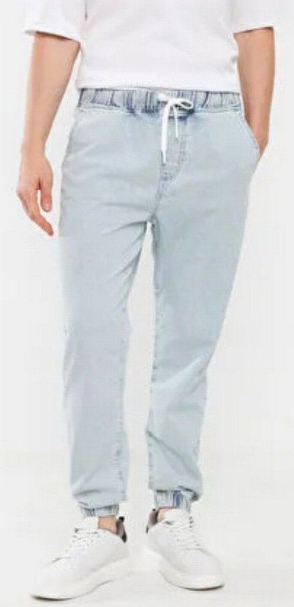 Mavi renkte, pastel tonlu, regular fit denim erkek pantolon. Rahat sokak stili ve bağcıklı bel detayıyla günlük kullanım için uygundur.