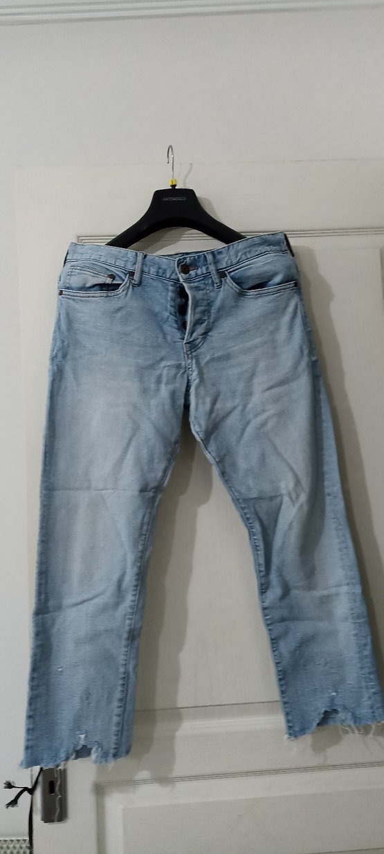 Düğmeli, mavi renkte, regular fit ve midi boy erkek kot pantolon. Gri tonlu, günlük kullanım için uygun, rahat ve şık bir tarz sunar.