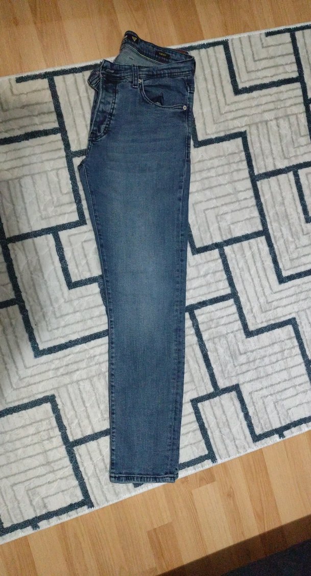 Düğmeli, mavi renkte, regular fit ve normal boyda erkek kot pantolon. Günlük kullanıma uygun rahat bir model.