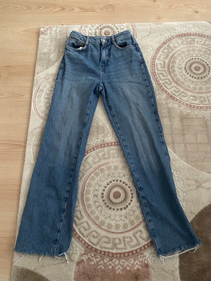 Mavi regular fit midi boy denim kot pantolon, hafif batik desenli. Rahat kumaş ve gündelik sokak tarzı için uygun, zahmetsiz şıklık sunar.