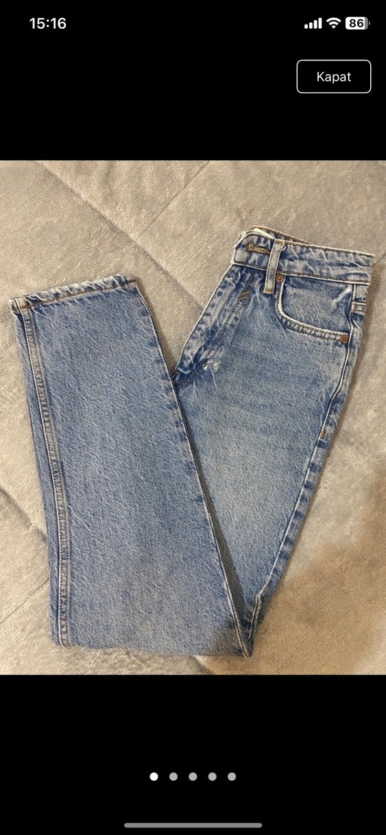 Mavi kot kumaştan, fermuar kısmınınu kenarında küçük bir aşınma vardır görünüş olarak rahatsız etmemekte 1.56 49 kg’yım bana biraz dar geliyor 47-49 arasındaysanız rahat olur