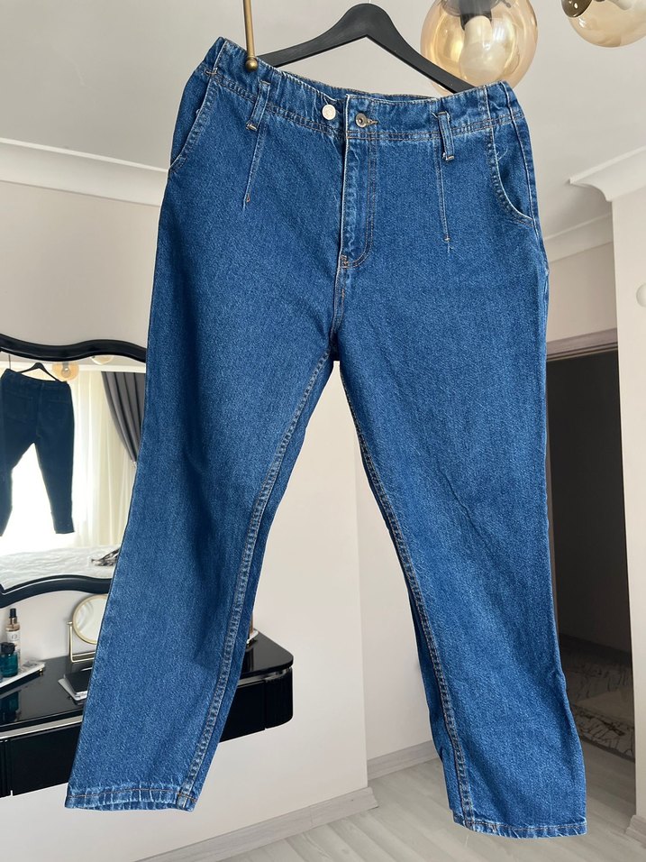 Denimden üretilmiş, mavi renkte, regular fit kesim ve tokalı detaylı midi uzunlukta kadın kot pantolon. Günlük kullanıma uygun streetwear tarzı.