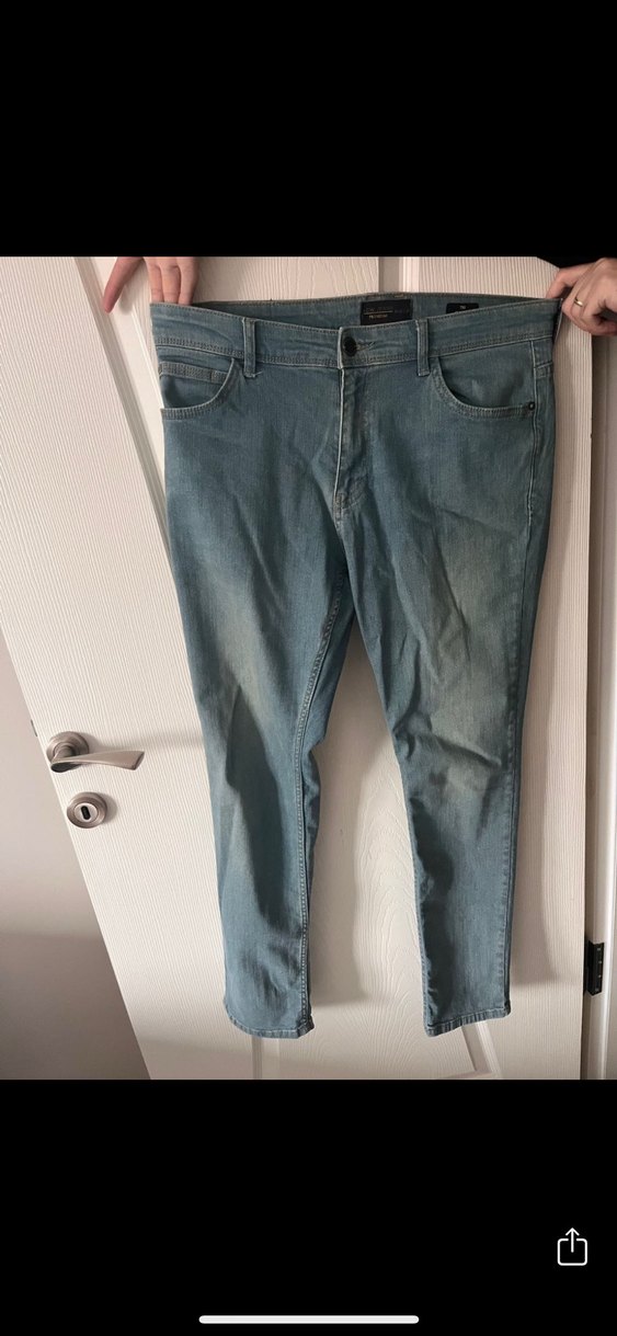 Mavi kot pantolon, regular fit, normal boy, kemerli ve günlük rahat sokak stili için uygundur.