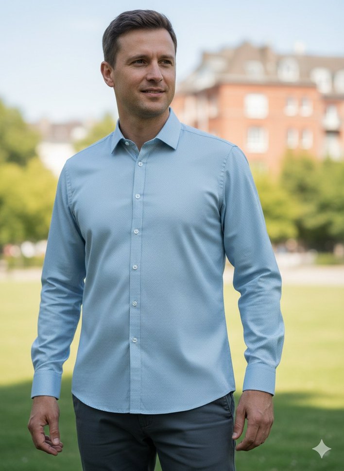 Düğmeli, uzun kollu, regular fit erkek gömlek. Sentetik kumaştan, mavi-gri tonlarında, iş ve günlük sokak tarzına uygun.