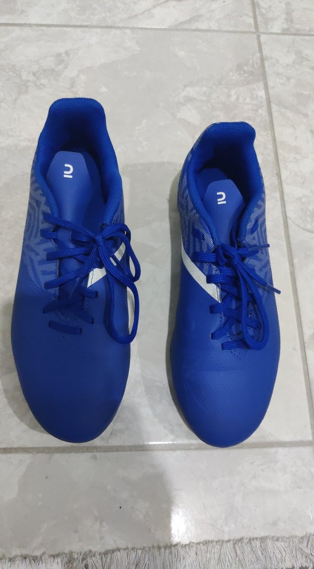 Mavi renkli, lastik tabanlı, erkek ve kız çocuk krampon ayakkabısı, sade ve desen içermeyen halı saha ayakkabısı