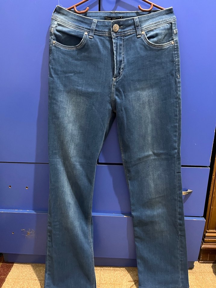 Mavi kot pantolon, normal kesim ve midi boyda. Tokalı detayları ve parlak görünümüyle günlük kullanıma uygundur.
