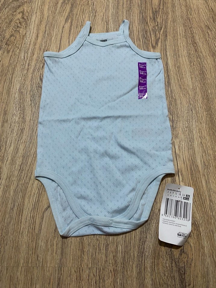 Pastel mavi renkte, ip askılı bebek body. Yumuşak dokulu, kolay giyilen rahat bir tasarıma sahiptir. 3 yaş bebek için uygundur. Ürün kullanılmamıştır, etiketi üzerindedir. Değişim ve iade yoktur.
