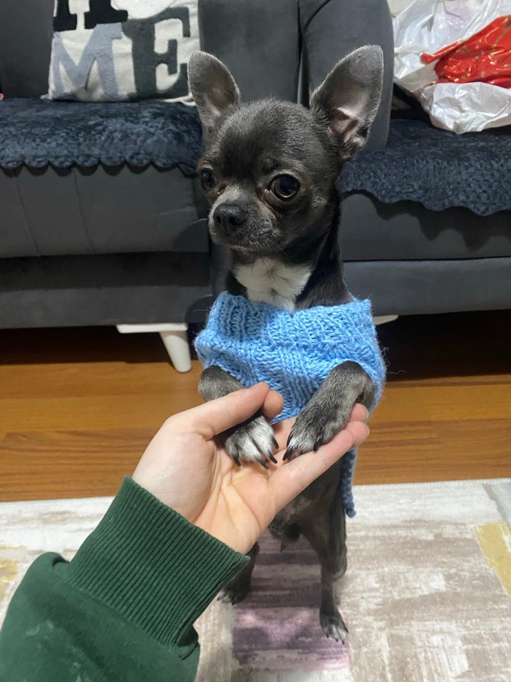 Örgü, desensiz mavi köpek kazağı. Normcore tarzıyla sade ve rahat bir kullanıma sahip.