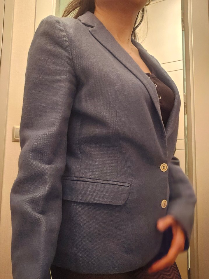 mavi düğmeli blazer ceket. normal kesim ve midi boydadır. Ofis için uygun, trend ve sade bir tarza sahiptir. 0/34/xs beden. yargıcı marka.