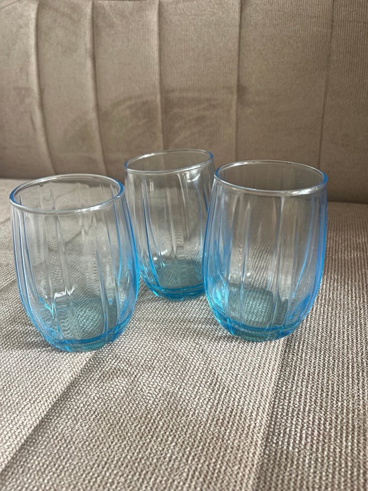Ribbed tasarımlı, mavi tonlarında 3 adet cam bardak seti. Yuvarlak ve renkli mavi dip detayına sahip.