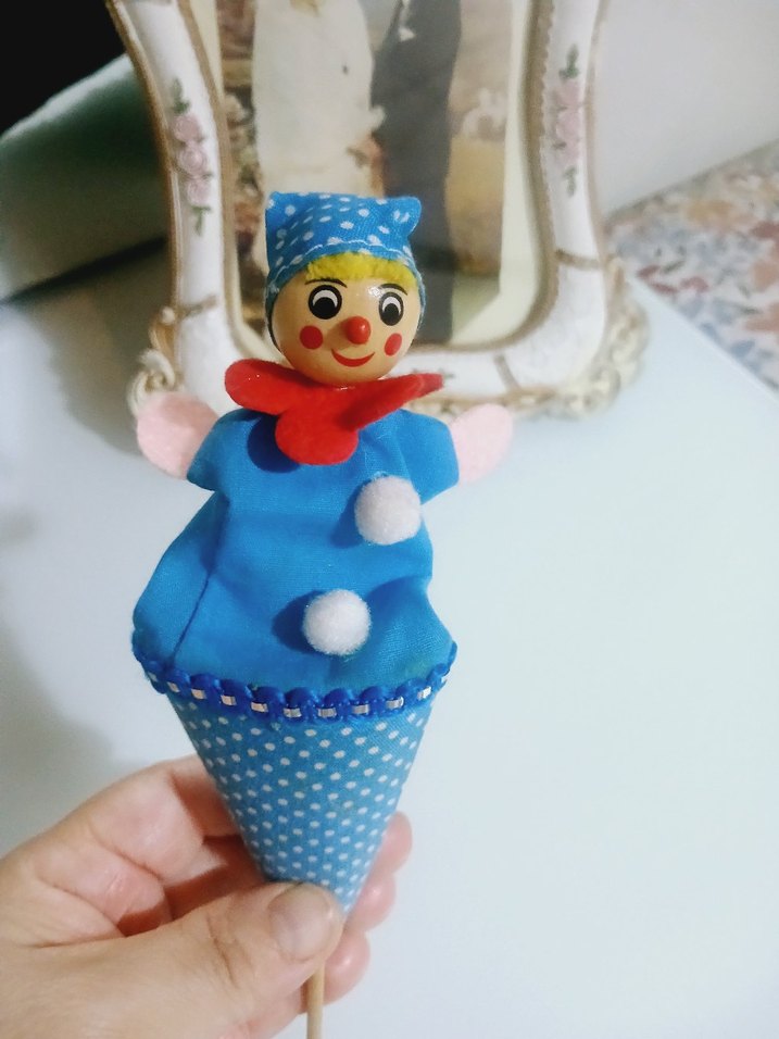 Mavi kıyafetli, külah şeklinde tabana sahip, gülen yüzlü ve süslemeli ponponlu renkli ahşap bebek. TERTEMİZ yüzü ahşap el boyaması