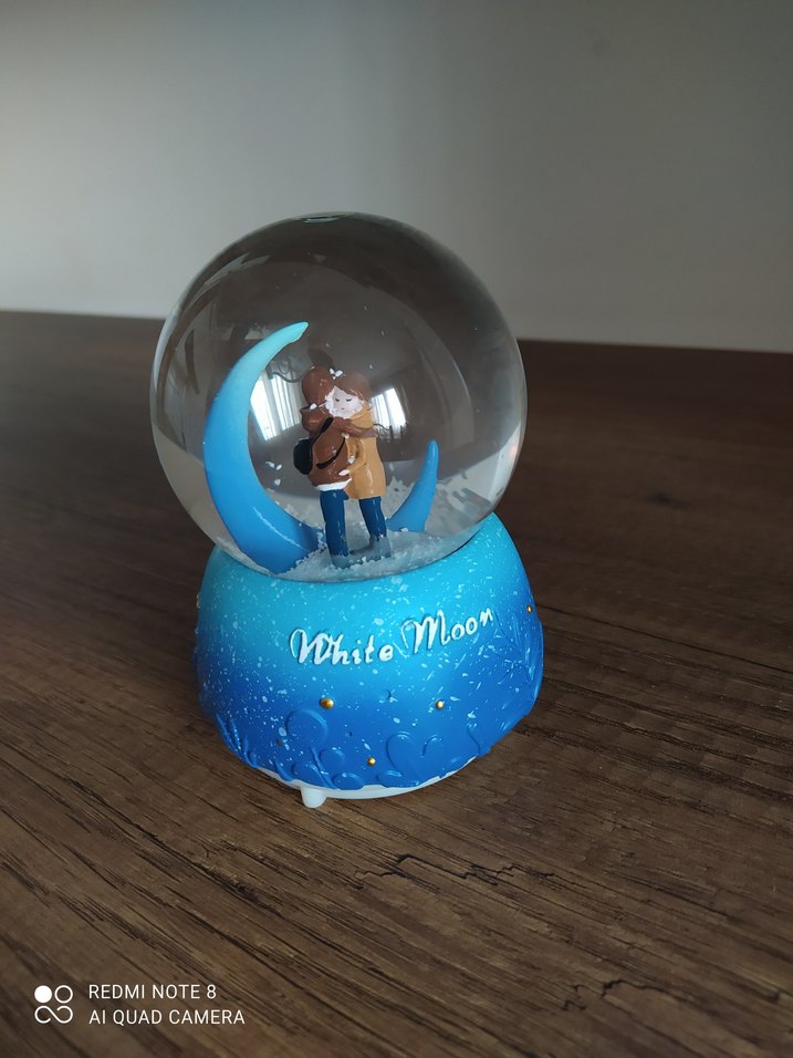 Renkli mavi kar küresinde, hilal ay içinde duran bir çift figürü bulunur. Altında 'White Moon' yazısı ve dokulu tasarım vardır. Işıklı ve müzikli çalışır durumda❄️ Tek kusuru görselde göründüğü gibi pil yuvasında sol taraftaki yay pili içinde durduğu için biraz paslanmış. Pille gönderilecektir.