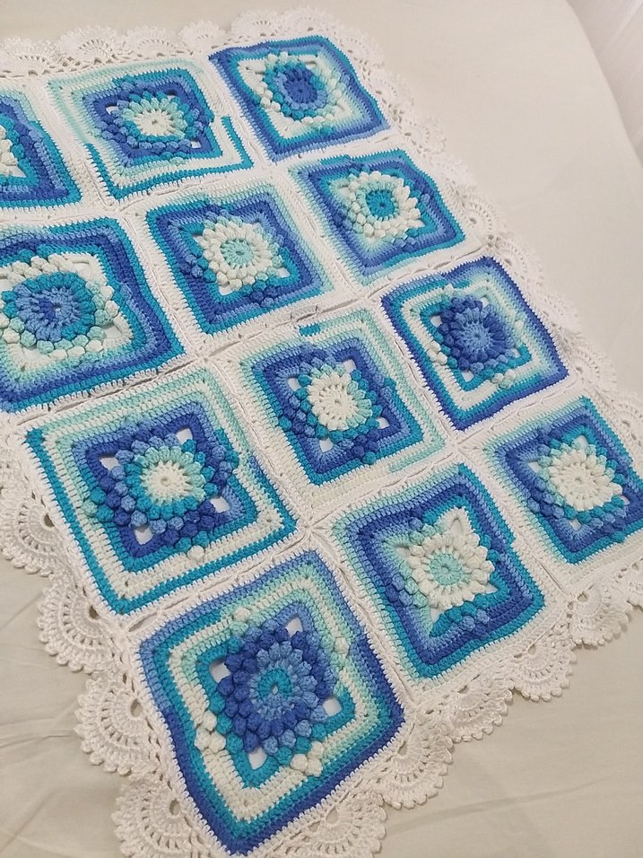 Renkli mavi bağlama desenli, detaylı tığ işi ve beyaz dantel kenarlıklı battaniye.yeni hic kullanılmadı