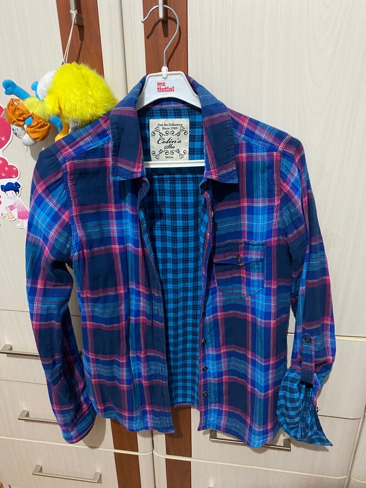 Rahat kesim, düğmeli uzun kollu, yakalı pamuklu kumaştan, renkli mavi bağlama desenli gömlek. Günlük sokak stili için uygun.