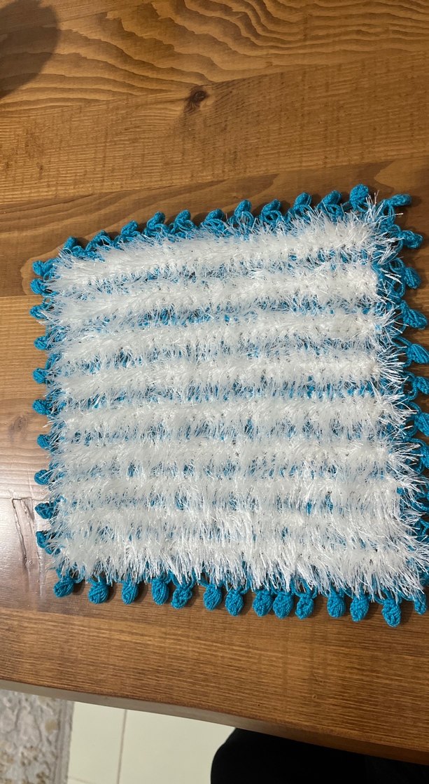 Mavi renkli, dokulu yüzeye ve kenarlarında halka detaylarına sahip renkli banyo süngeri.