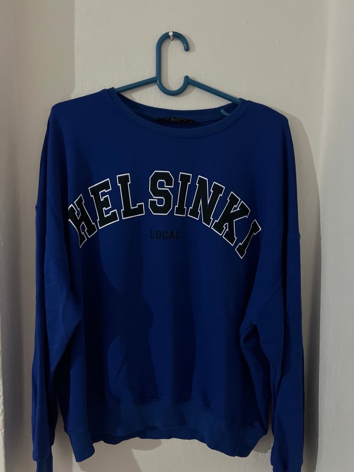Kadınlar için, yuvarlak yaka ve uzun kollu, bol kesim sweatshirt. Mavi renkte, baskılı yazılı. Günlük kullanıma çok uygundur.