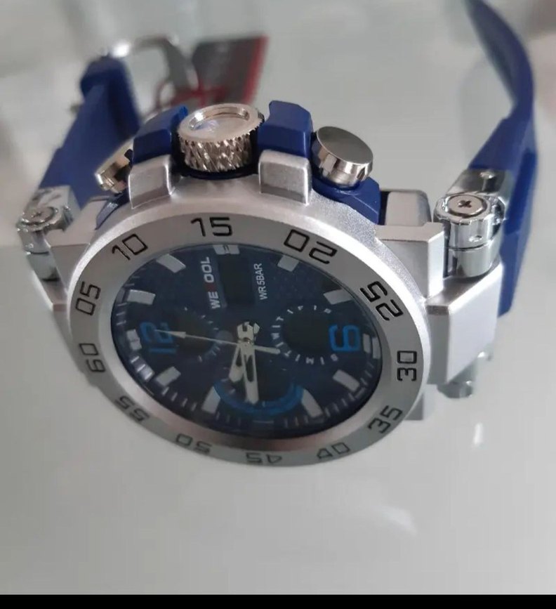 Bu erkek kol saati, renkli mavi tasarımı ve biker tarzıyla dikkat çeker. Kadranda 15, 100, 02 ve 30 sayıları bulunur, sokak stiline uygundur. ⌚
