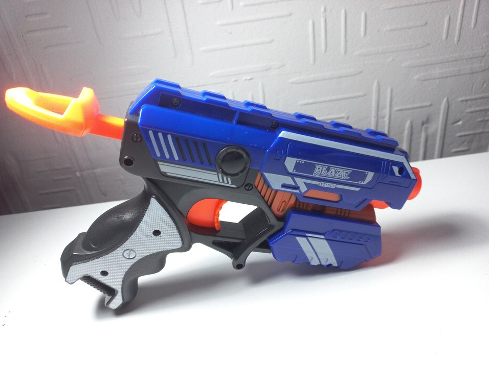 Mavi, turuncu ve gri detaylara sahip renkli oyuncak tabanca. Yanında "BLAZE" yazısı bulunur. Detaylı tasarımı ile oyun için uygundur. sünger mermileri elimde yoktur.