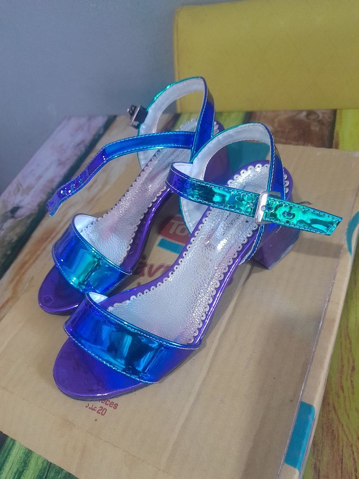 Mavi renkli, geçişli yanardönerli rengi var tokalı bantlı, blok topuklu kız abiye ayakkabısı, renkli baskılı ve çağdaş tasarım.