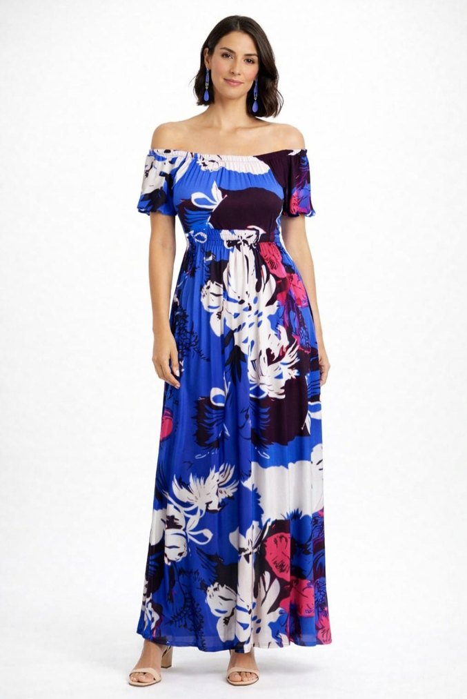 Mavi renkli uzun elbise, renkli çiçek desenli, bol kesim ve pileli tasarıma sahip. Kayık yaka ve omuzları açık ince askılı kollu, yumuşak sentetik kumaştan yapılmıştır. Romantik akşamlar için uygun. Std beden