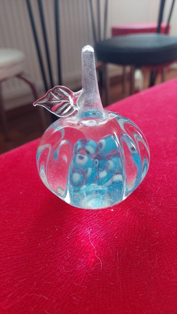 Mavi detaylı, şeffaf camdan yapılmış figür, sapında detaylı yaprak bulunur. kar küresi gibidir. içi dışı komple cam olup içinde nazar boncukları var.