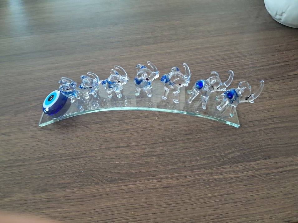 Renkli mavi camdan yapılmış, detaylı fil figürleri seti. Koleksiyonlar için uygun.