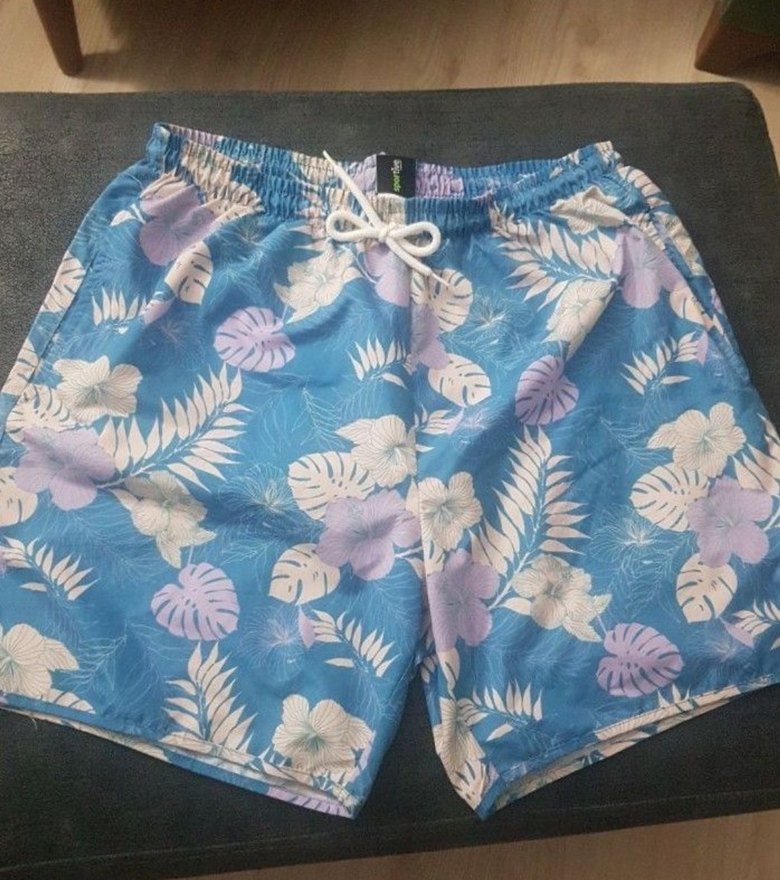 Canlı renkli çiçek desenli, bol kesim mavi erkek deniz şortu, bağcıklı bel detaylıdır. Rahat ve plaj stiline uygundur.
