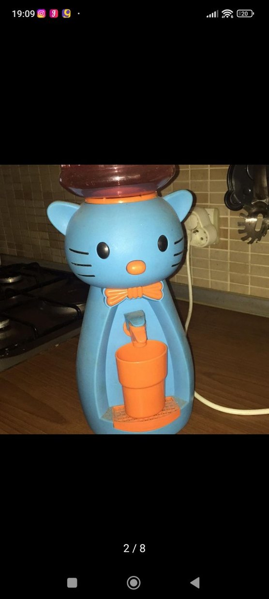 Mavi renkli, kedi figürlü çocuk su sebili, turuncu fiyonk ve bardak ile beraber gelir.