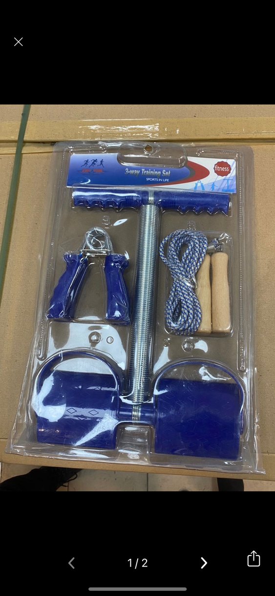 Mavi renkli egzersiz setinde ahşap saplı ip atlama ipi, el kavrama aparatı ve yaylı bilek güçlendirici bulunur. Çok yönlü antrenman için uygundur. ️
