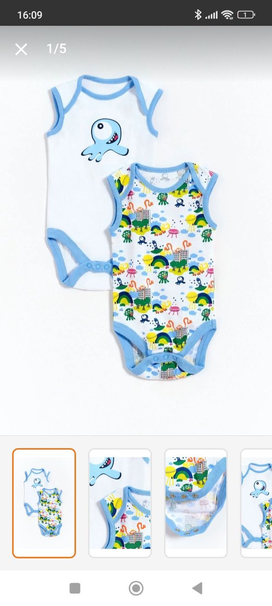 Mavi detaylı, askısız ve çıtçıtlı iki erkek bebek body seti. Birinde balık baskısı, diğerinde renkli deniz temalı desenler bulunur.