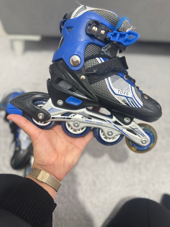 Mavi renkli, bağcıklı erkek biker tarzı paten. Renkli yılan deseni ve kauçuk tekerleklerle spor ve athleisure için uygundur. 30/31/32/33