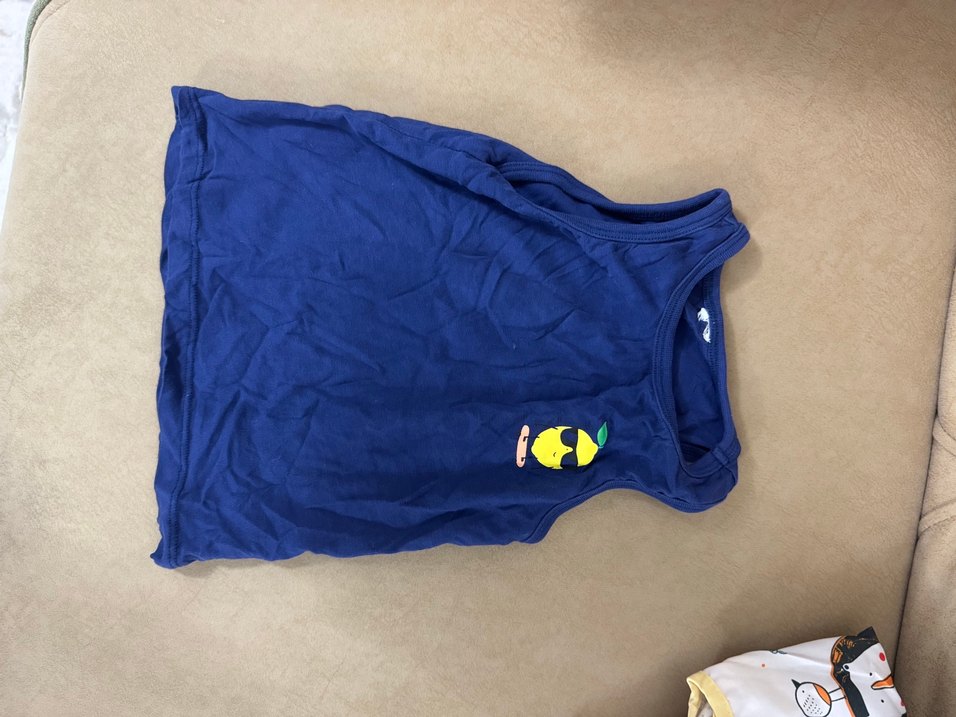Mavi renkte, göğüs kısmında küçük renkli meyve baskısı bulunan erkek çocuk atleti. Kolsuz ve yumuşak dokulu kumaştan üretilmiştir.