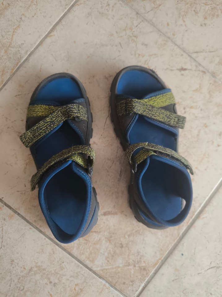 Mavi yeşil erkek çocuk terlikleri, renkli batik desenli cırt cırtlı bantlı. Rahat ve kolay giyilir, herhangi bir kusuru yoktur küçük geliyor.