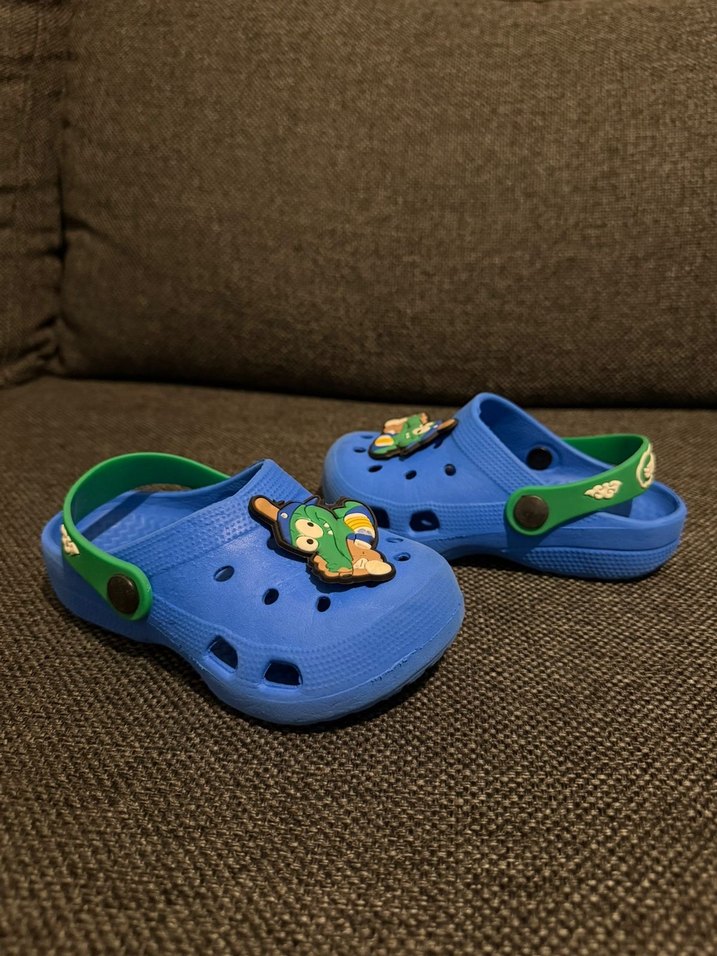Mavi kauçuk erkek çocuk terliği, renkli baskılı detaylar ve ayarlanabilir cırt cırtlı bantlarla sokak stili için uygundur.