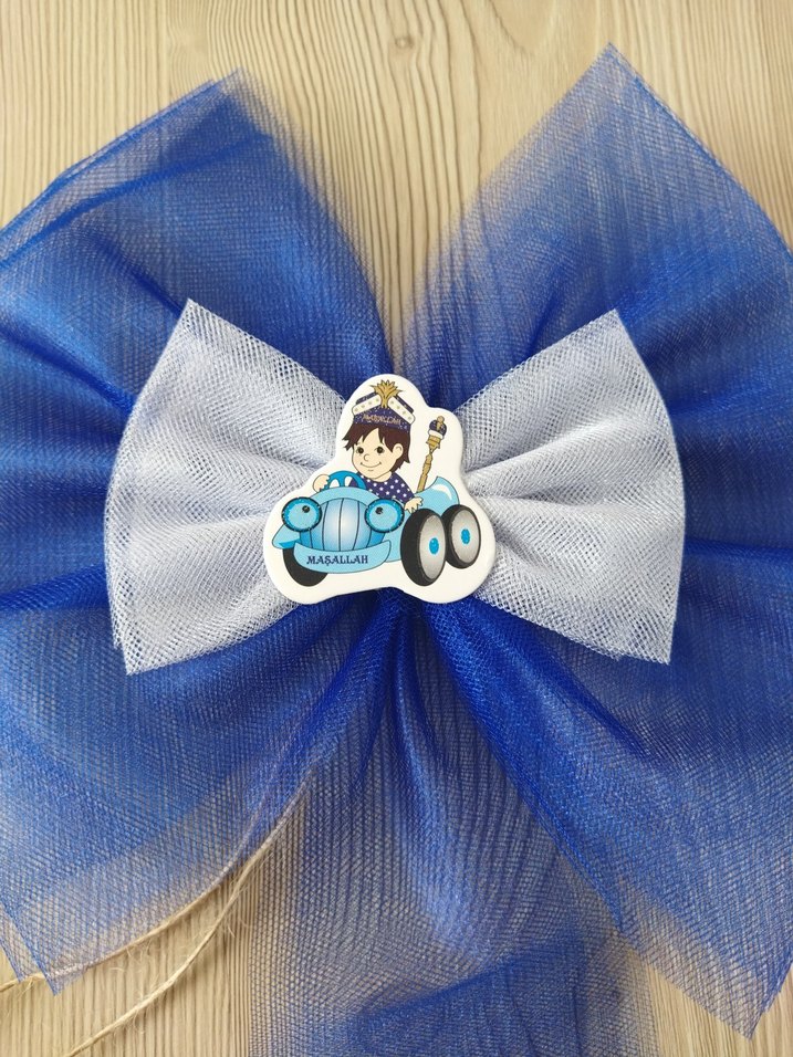 Mavi ve beyaz renklerde, yumuşak kumaştan yapılmış fiyonk üzerinde plastik, renkli çizgi film baskılı aksesuar. sünnet konvoy süsü adet 20 tl istenilen adet alabilirsiniz