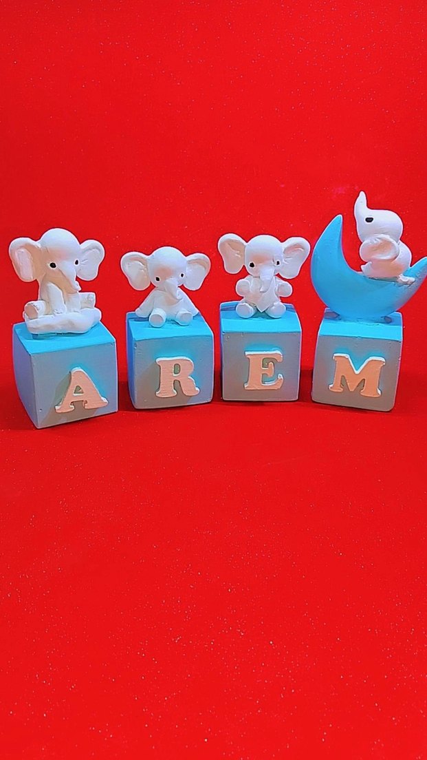 Üzerinde fil figürleri olan, her biri farklı harf taşıyan renkli mavi bloklar, 'AREM' ismini oluşturuyor. 1 adet harf figür fiyatidir
