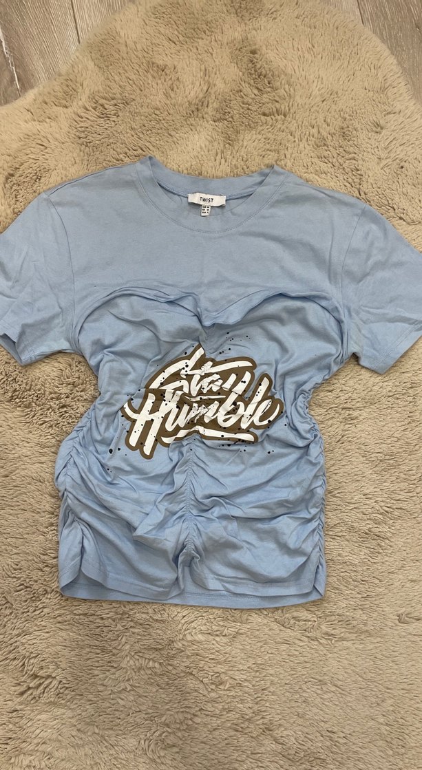 Mavi renkli kadın tişörtü, kısa kollu ve yuvarlak yaka. Rahat kesimi ve fırfır detaylarıyla dikkat çeker. Önünde baskılı desen vardır. Pastel tonları ve kısa boyu günlük kullanıma uygundur. s-m uyumlu