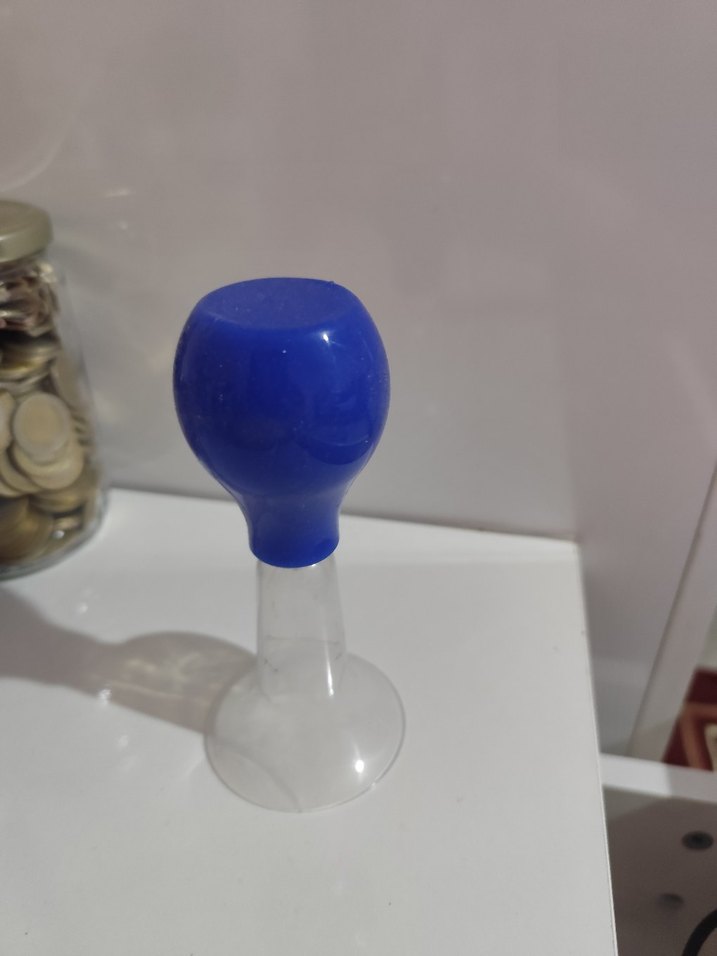 Mavi renkli silikon pompa başlığı ve şeffaf plastik emme kısmı bulunan göğüs pompası.